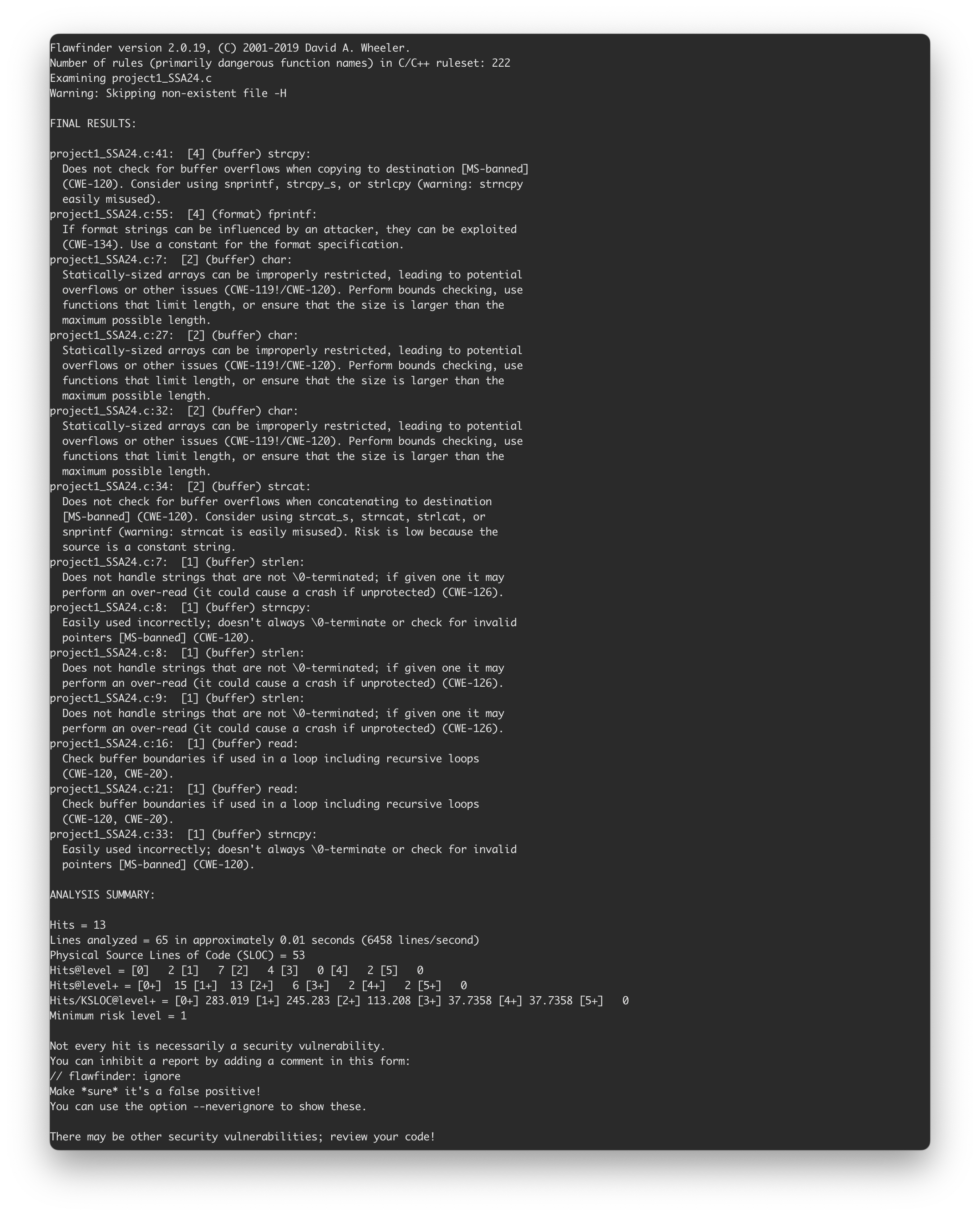 This project involves using Flawfinder a static analysis tool, to scan a C code fragment for potential security vulnerabilities. The goal is to identify and address these flaws, demonstrating the tool’s effectiveness while highlighting the need for manual code review to catch any issues that may have been missed.